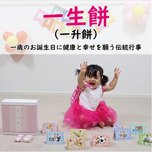 一歳のお誕生日のお祝いに「一升(約1.8kg)」分のお餅をお子様に背負わせ、成長を祈る伝統行事「一生餅のお祝い」