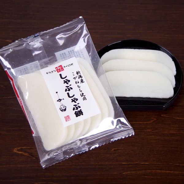 新潟産こがねもち米100%使用の薄切り餅です。 杵つき製法で薄くても煮くずれしにくいので、鍋もの、麺類などに最適です。
